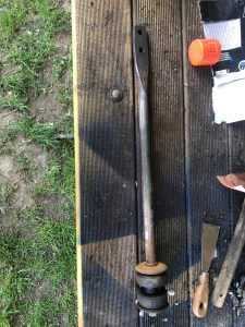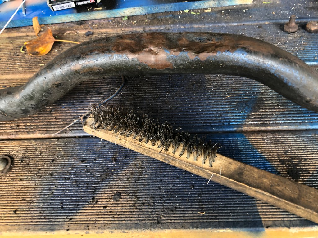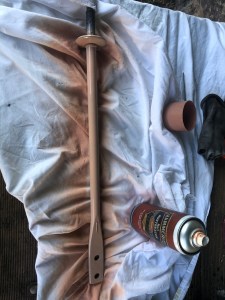 Both strut rods were straight and therefore could be reused. To clean them up, I first gave them a good scrub with a wire brush to remove most of the surface rust and flaking paint. Then I hand sanded them with some 200 grit sandpaper before painting (but not the thread) with a rust killer undercoat. Once this was dry I gave them 3 coats of matt satin black.