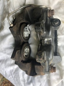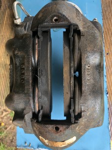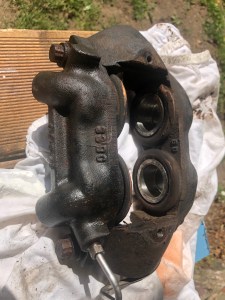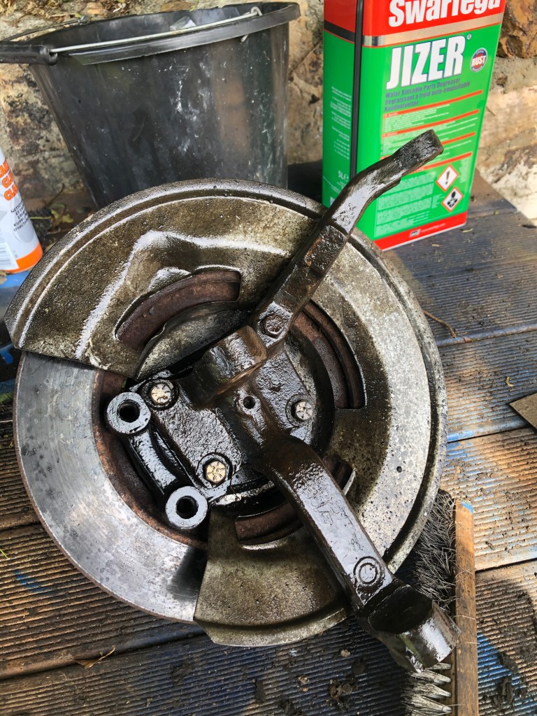 For the front disc brake/spindle assembly, I just need to remove all the dirt & grime before re-installation. A good wire brushing and the faithful putty knife, plus a coat of ‘jizzer’ degreaser did the trick. I then gave the discs a blast of brake cleaner for good measure before reinstalling on the car.