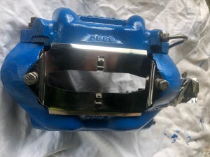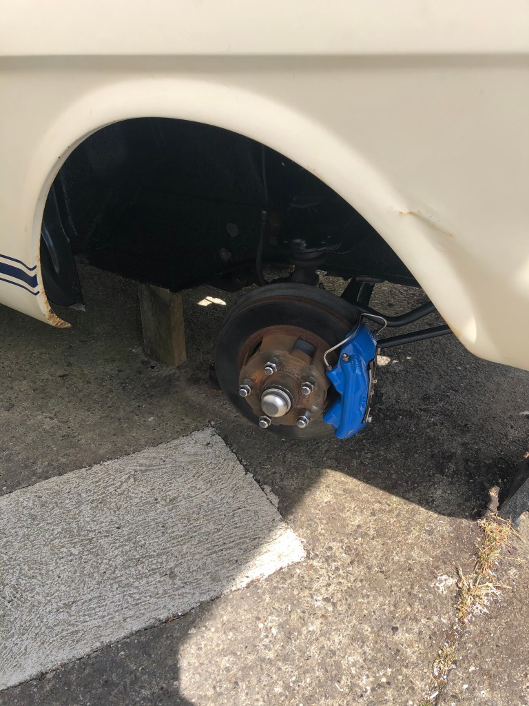 As I was replacing the front suspension, I thought I would have a go at painting the front disc brake calipers. I chose a kit which came with a brake cleaner spray can, small paint brush and a tin of blue enamel paint.