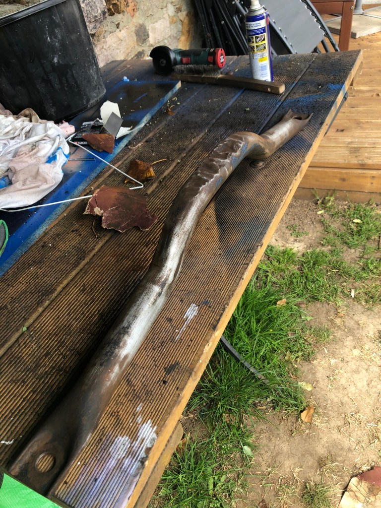 Once this was done the entire thing was wire brushed clean before sanding and paint. I was able to bolt it back on the car by adding extra wide washers on the driver side. I’m counting on this holding enough to allow me to jack the car off the axle stands when I’m done with the suspension. Then I’ll drive it the 1km up the road to my local garage and ask them to do some welding ‘magic’.