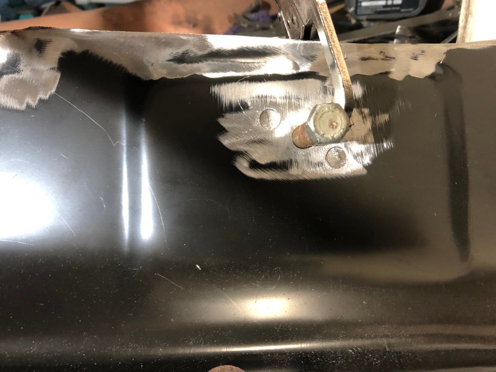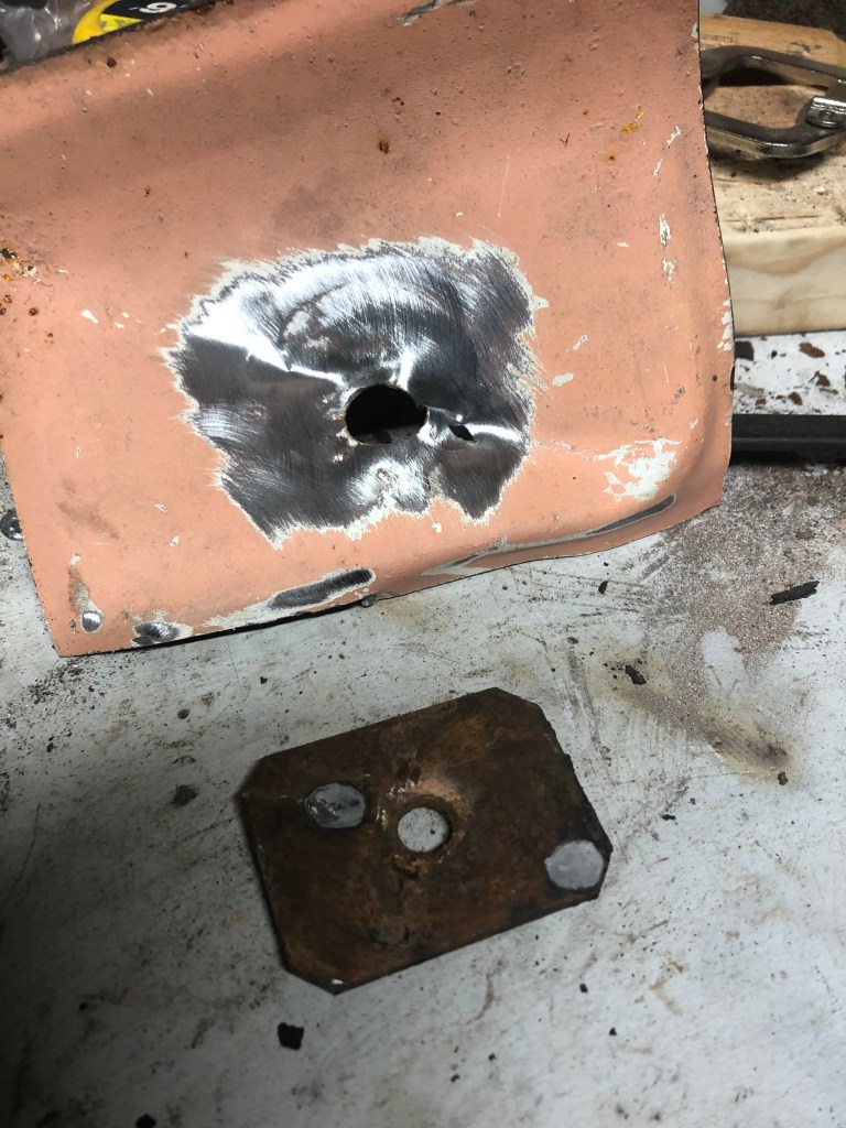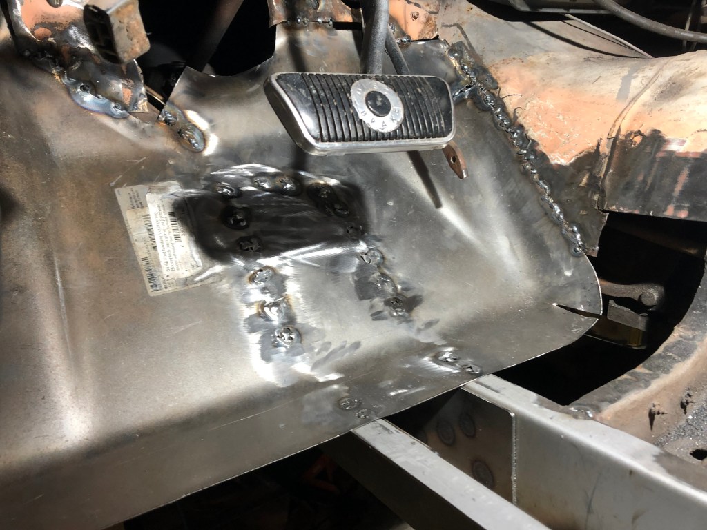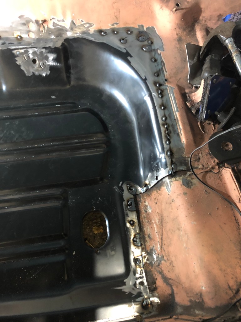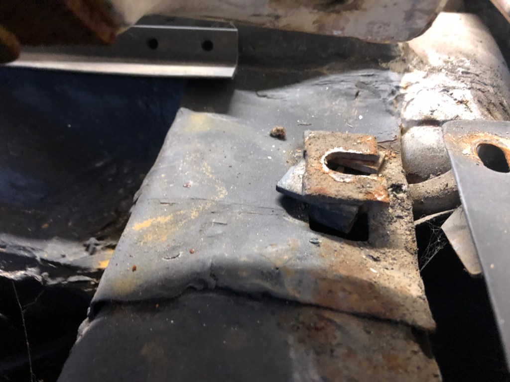 There is a lot more to do to finish up the area where the toe board meets the firewall but for now I’m moving on to the floor pan itself. To start with I need to move the seat belt anchor bolt. The plate was welded with just two spot welds, which I was able to drill out before welding to the new pan. For additional strengthy I added some tack welds to the rear.