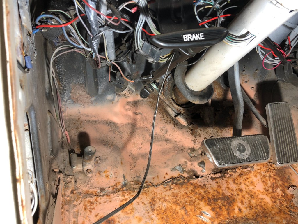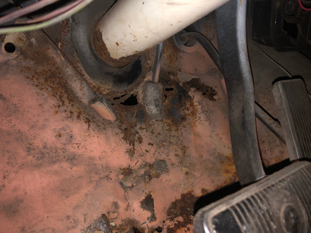 After a bit more poking with a screwdriver I decided I needed to cut out everything just under the steering column as it was too far gone. I disconnected the gas pedal from the carb linkage and then used a bungy cord to hold the lever and pedal away from the floor.