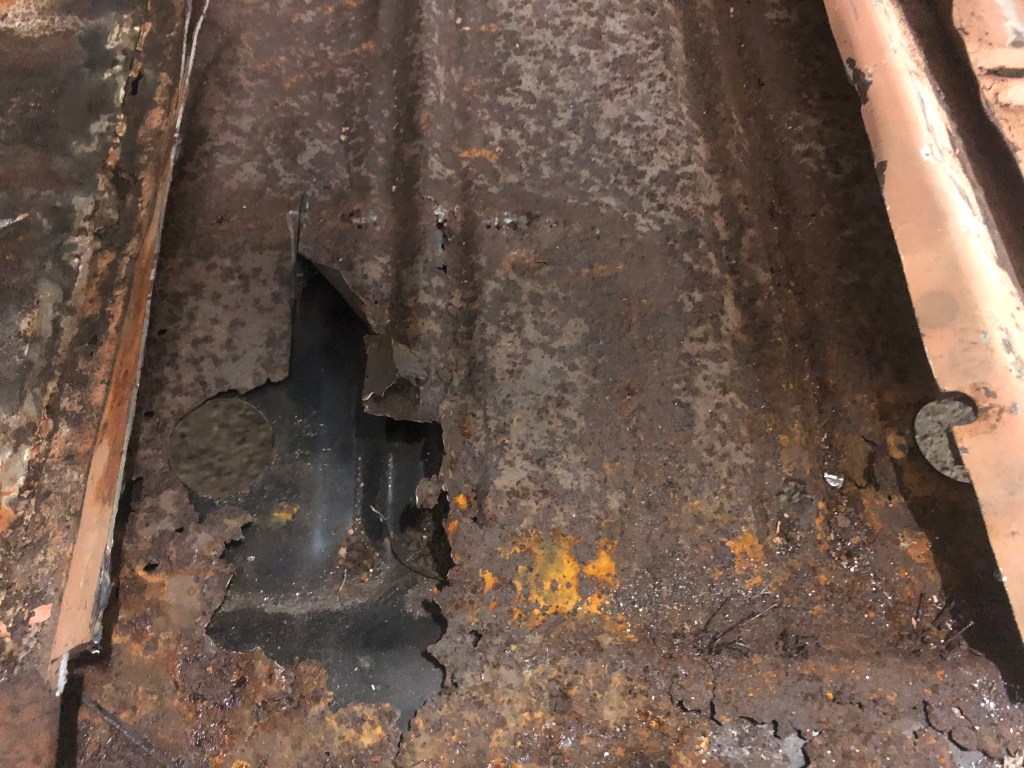 The floor had twisted upwards as a result of torque and weak welds/metal. The pictures below show the state of the metal under the seat platform. Lots of rust and I can see where someone in the past had simply welded another panel over the top of the old one. I found lots of mig wire still attached to the floor!