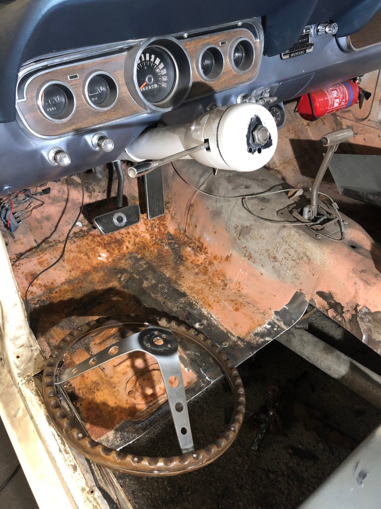 Next I need to work on the toe board / firewall area, ensuring the patch panel I have fits well. The metal around the steering column is very thin and I suspect needs to be cut out. The good news is that test fitting the new full length floor pan went well. It hugs the transmission and rocker panel nicely.