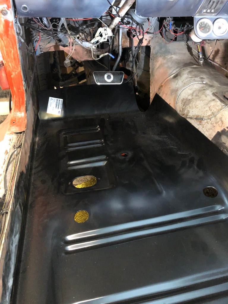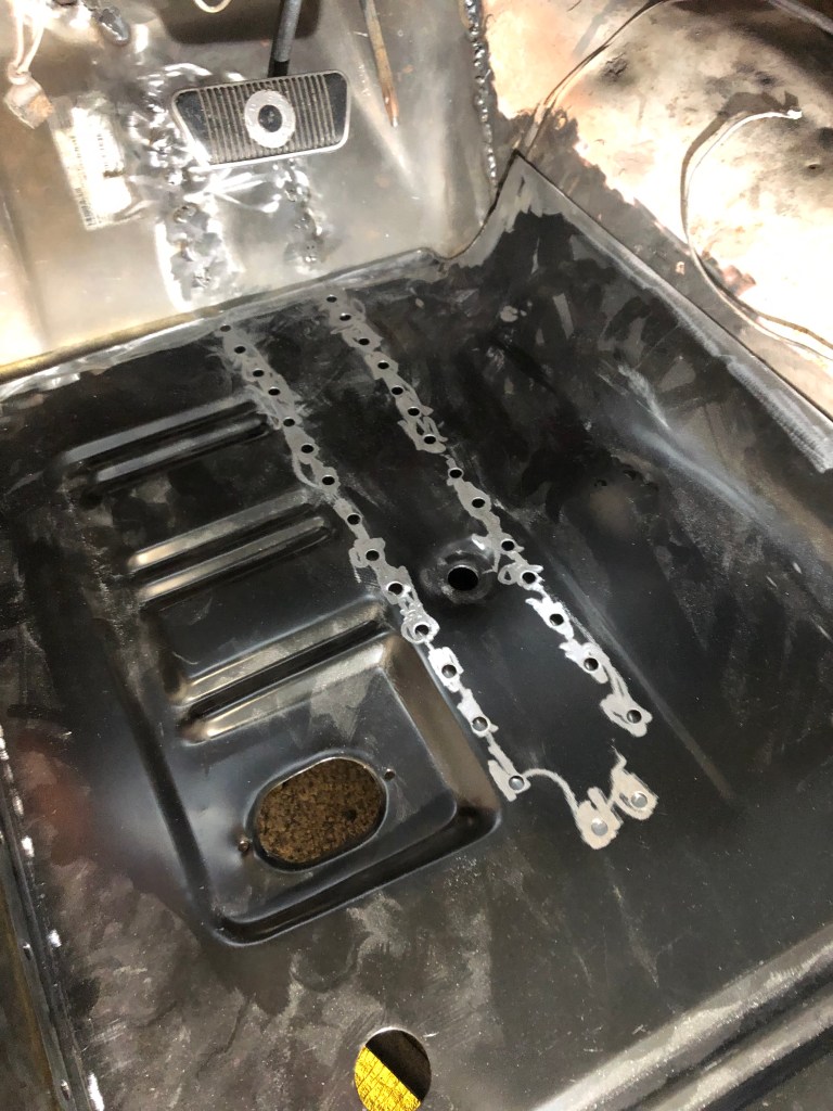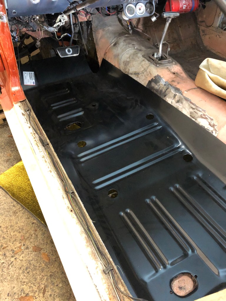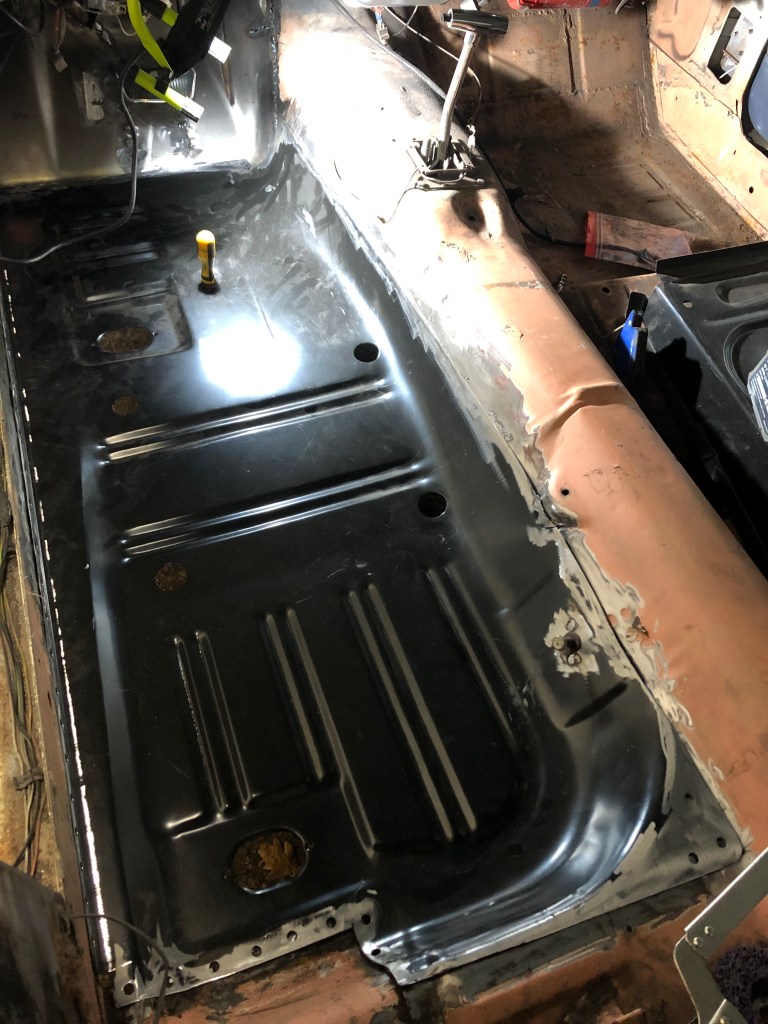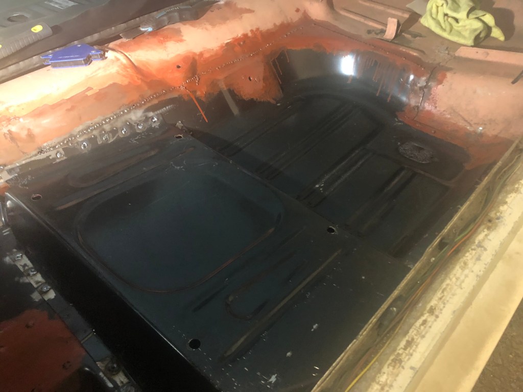 The welding went well and the new floor pan is in. I still have to tidy up the area where the front of the pan meets the toeboard and transmission tunnel. I also painted a few spots with anti-rust undercoat.