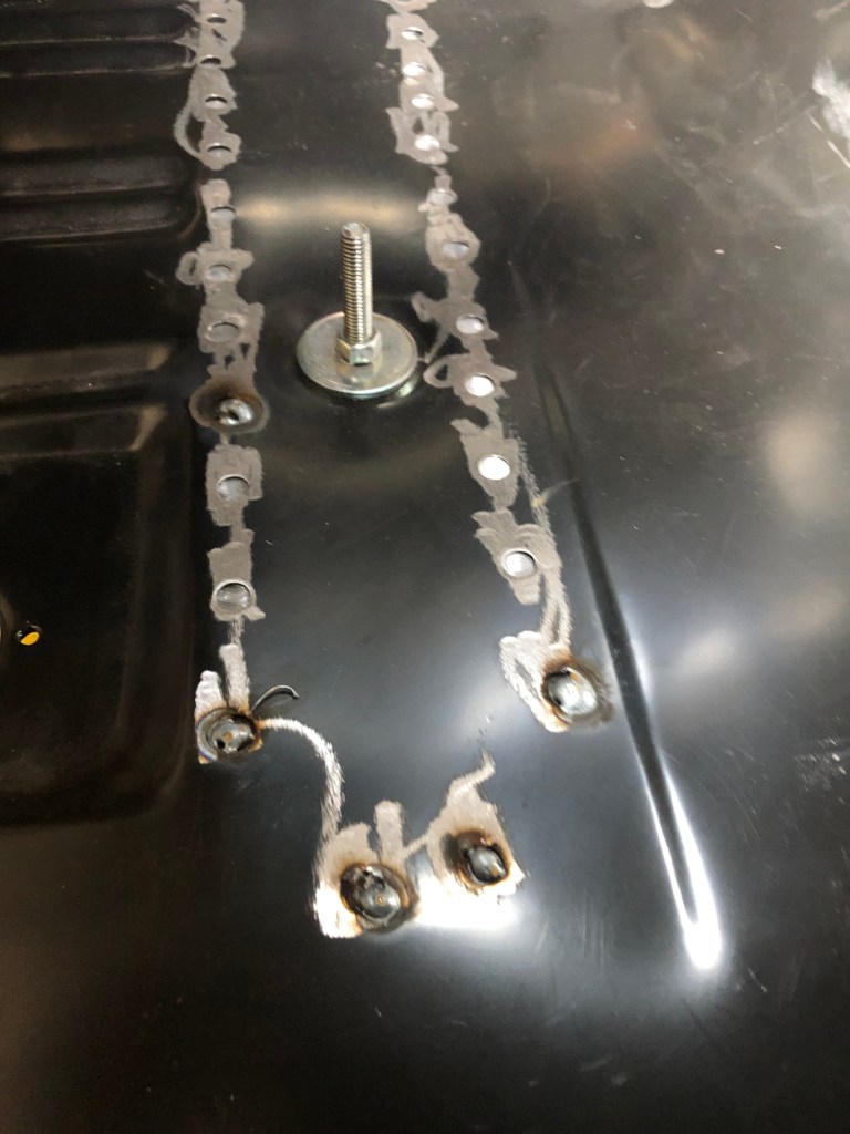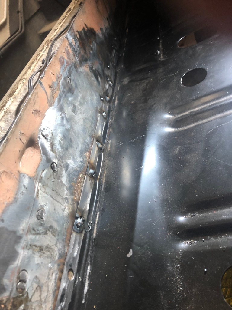 I then spent a good few hours test fitting and drilling spot welds. The only issue I have is that there is a CM gap between the new pan and the transmission tunnel brace. I’ve decided to leave this as is and address from under the car later. As you can see in the pictures below, I will be spot welding the pan to the rocker and rear torque box, as well as the a few spots where the new pan overlaps the old. The transmission tunnel will be tacked and sea welded.