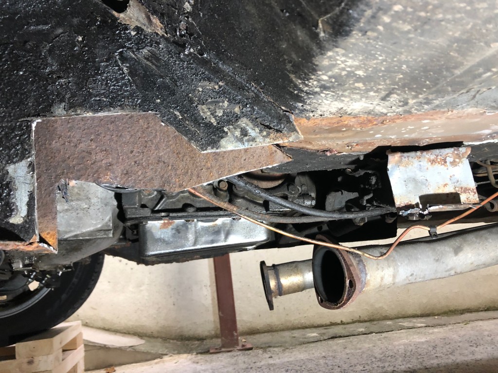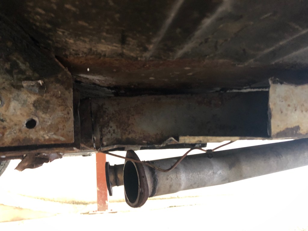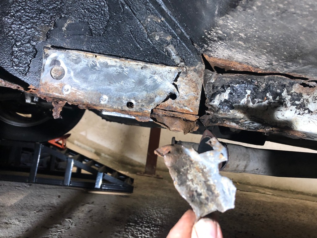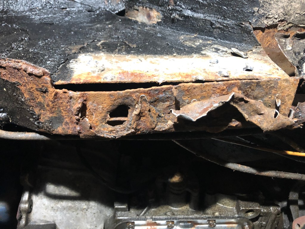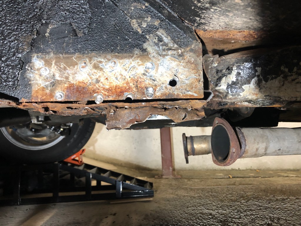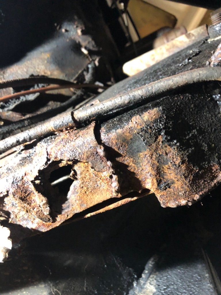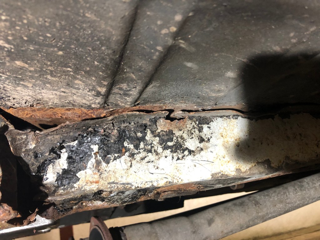 The frame rail itself looks ‘ok’ which is a relief, however you can see that the bottom of the rail doesn’t seem to be connected to the side. The underside is pretty bad with a hole towards the front of the above picture.