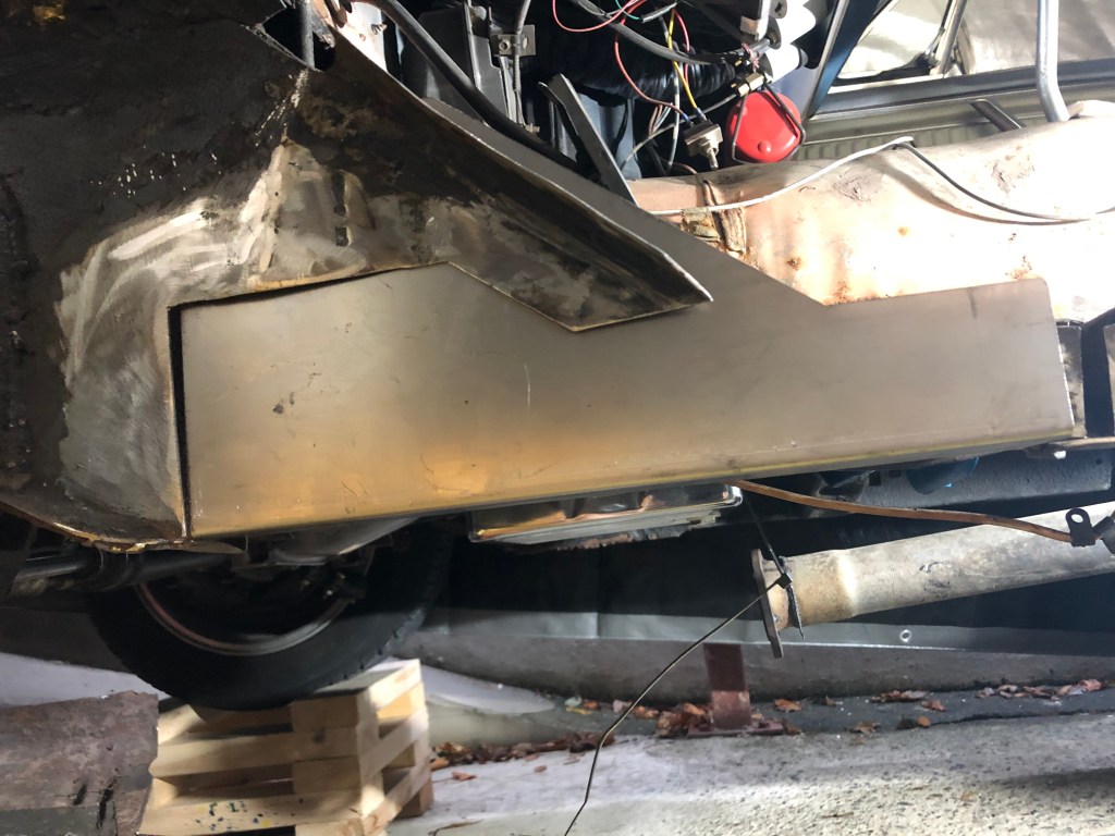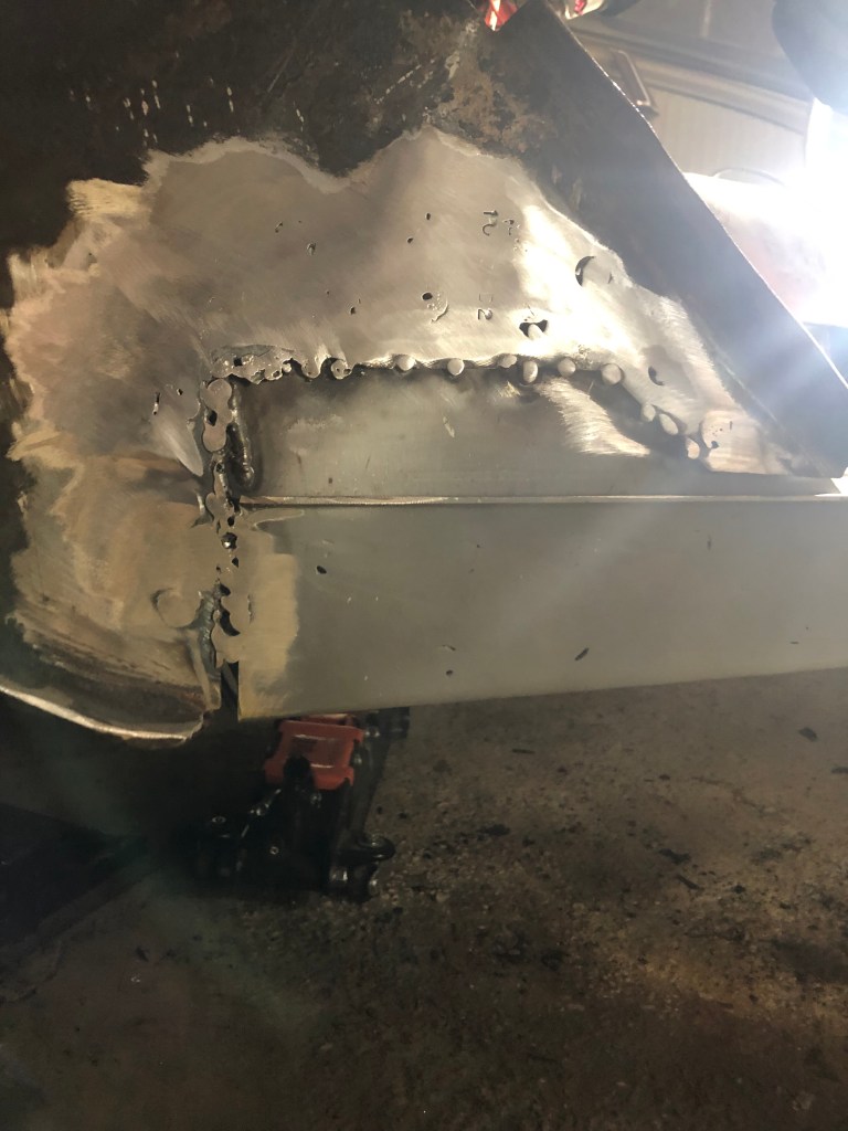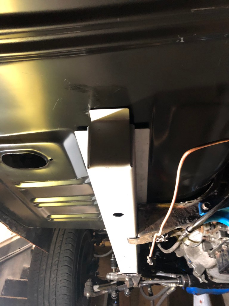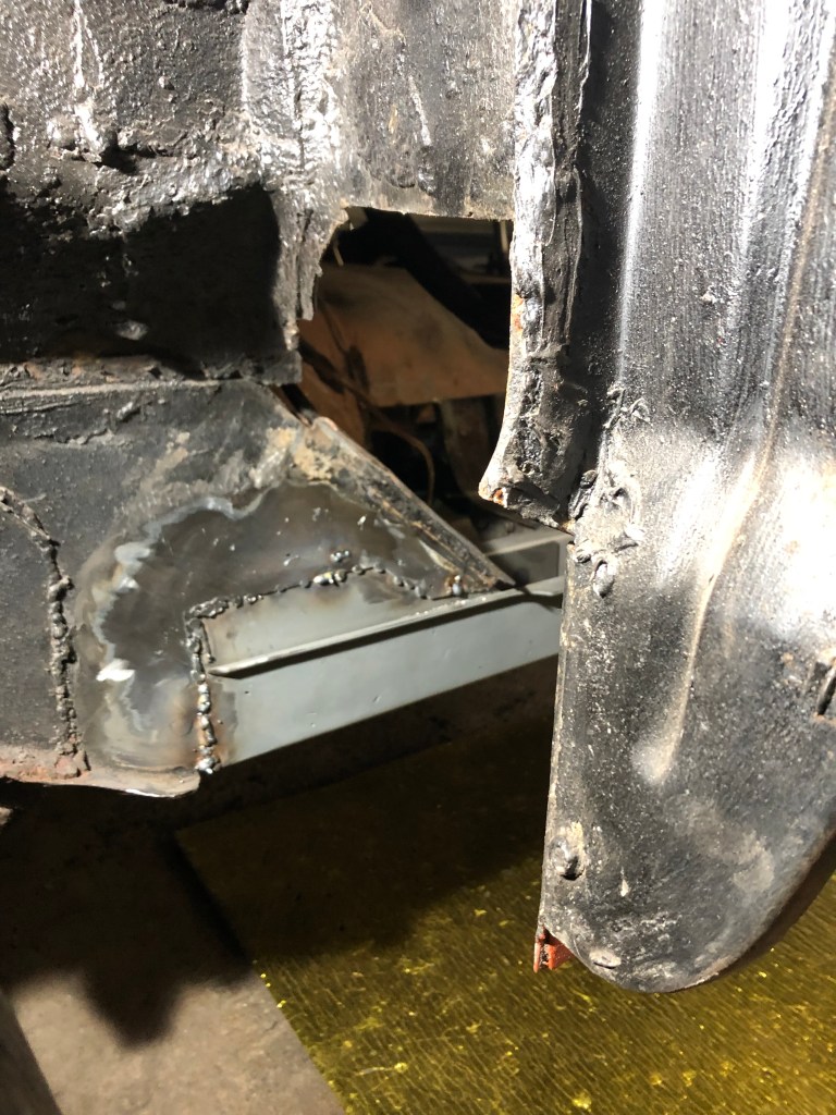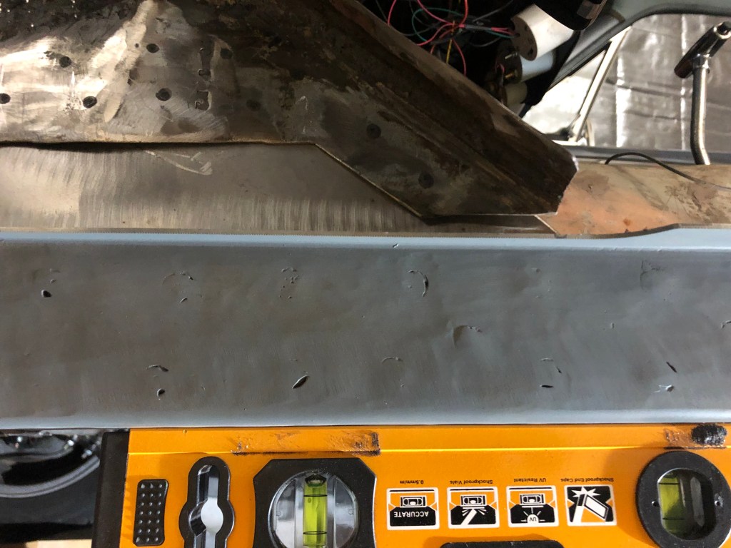 I finished the plug welds on both sides and the bottom of the floor support, waited for it to cool down and then ground them down before spraying a coat of weld thru primer to protect the metal. I’m really pleased with how it came out. I now have to work on fitting it so I can move on to the torque box install.
