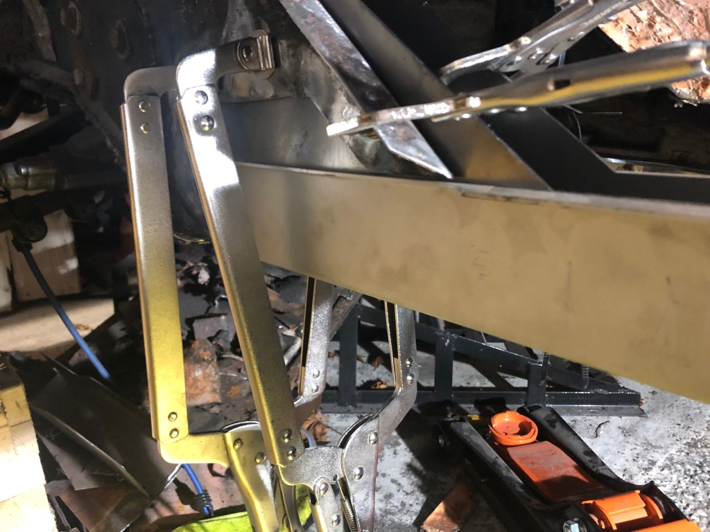 19th December 2021 – Well, today was a long time coming. I decided to attach the floor support to the patch panel which meant I didn’t need to do that welding when it was on the car. I started by drilling a load of holes for plug welds, grinding them flat and then clamping it all together before welding.