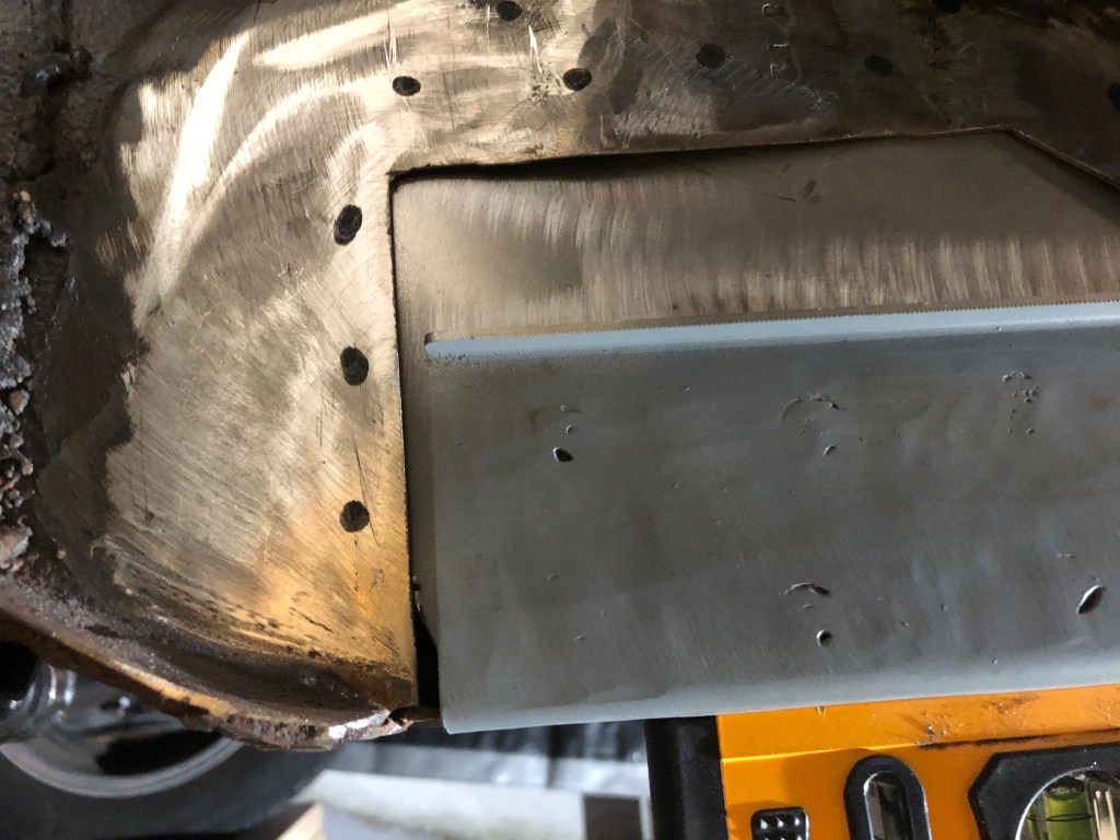 I have been working on how best to patch the drivers side frame rail. I’ve decided upon a blend of plug & seam welding to ensure the strongest possible fix. You can see the patch panel pushed up inside the frame rail below. I’m going to trim to ensure the front is below the flanges which will be welded to the toe board, drill holes for plug welds and then seam weld the heck out of it. Once that’s done I’ll be able to add the floor support which I’ve test fit as you can see in the last few photos below.