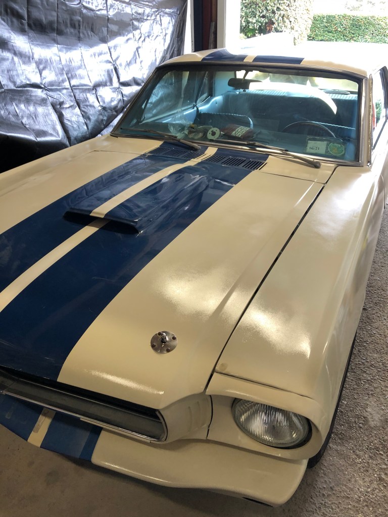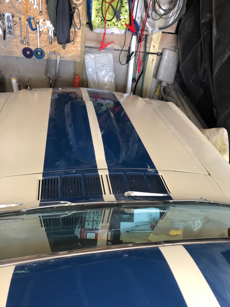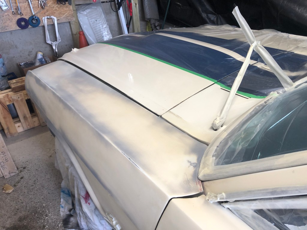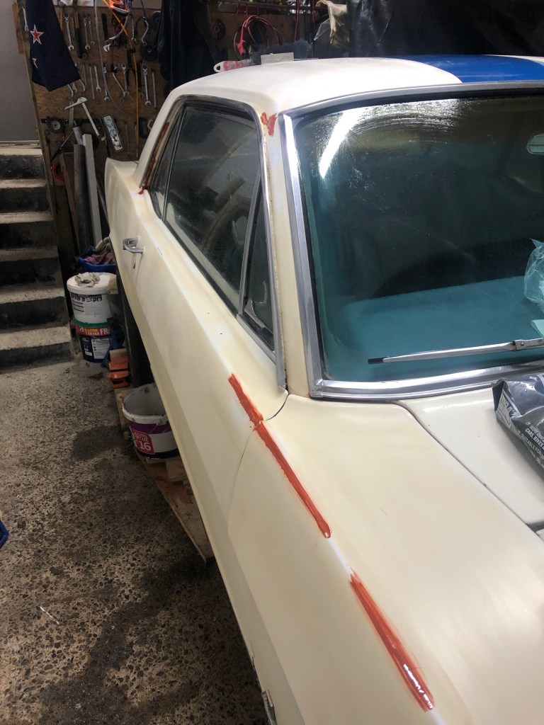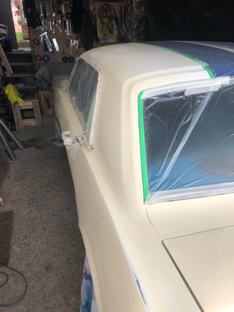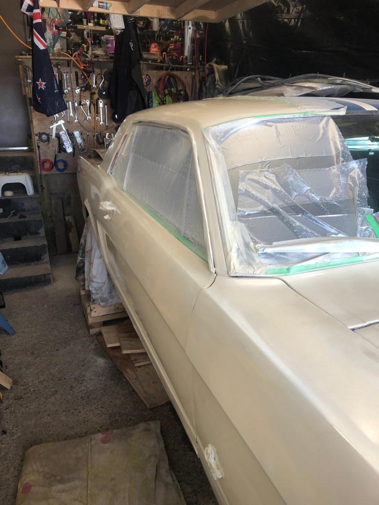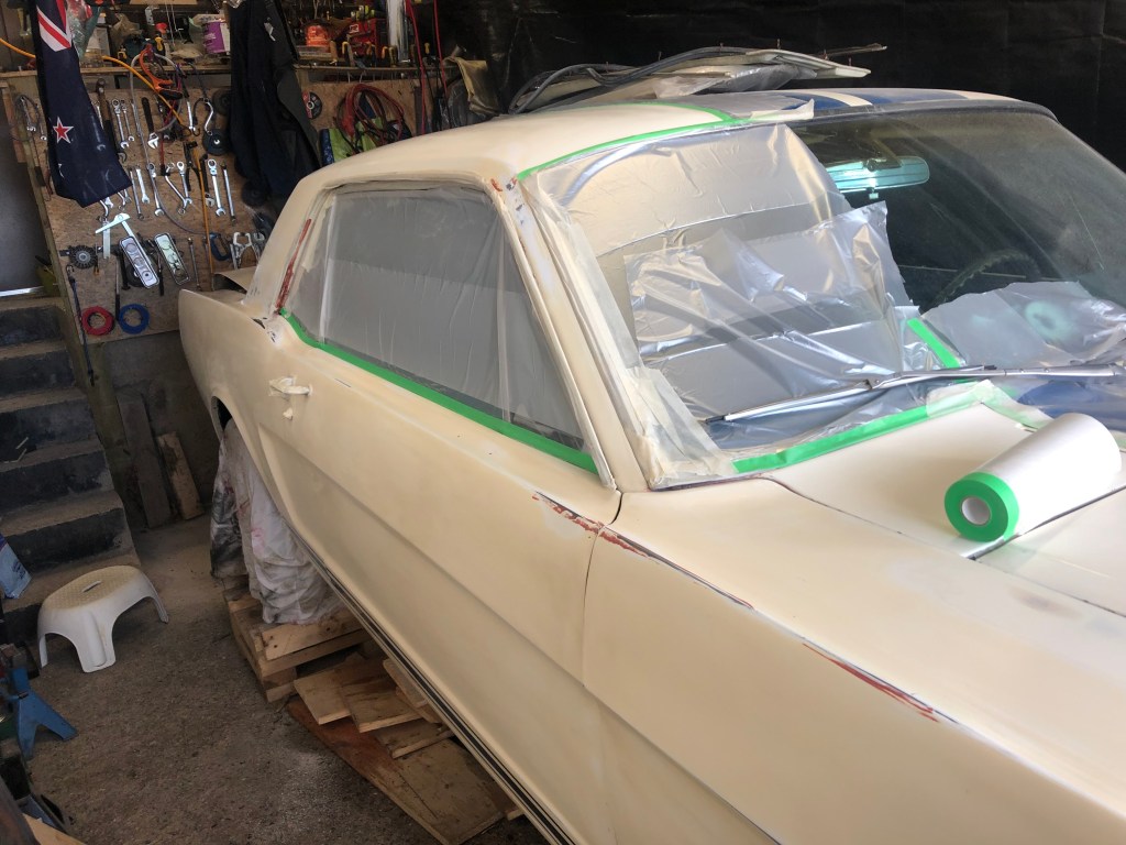 The prep, including some small areas of filler (to ensure an even surface) took a few hours. I also used some plastic sheeting that came with tape (normally used by interior painters) and this worked really well, althoug in hindsight I should have covered more of the car as the overspray was quite bad, however I was able to remove it from the windscreen and blue stripe with very fine sandpaper.