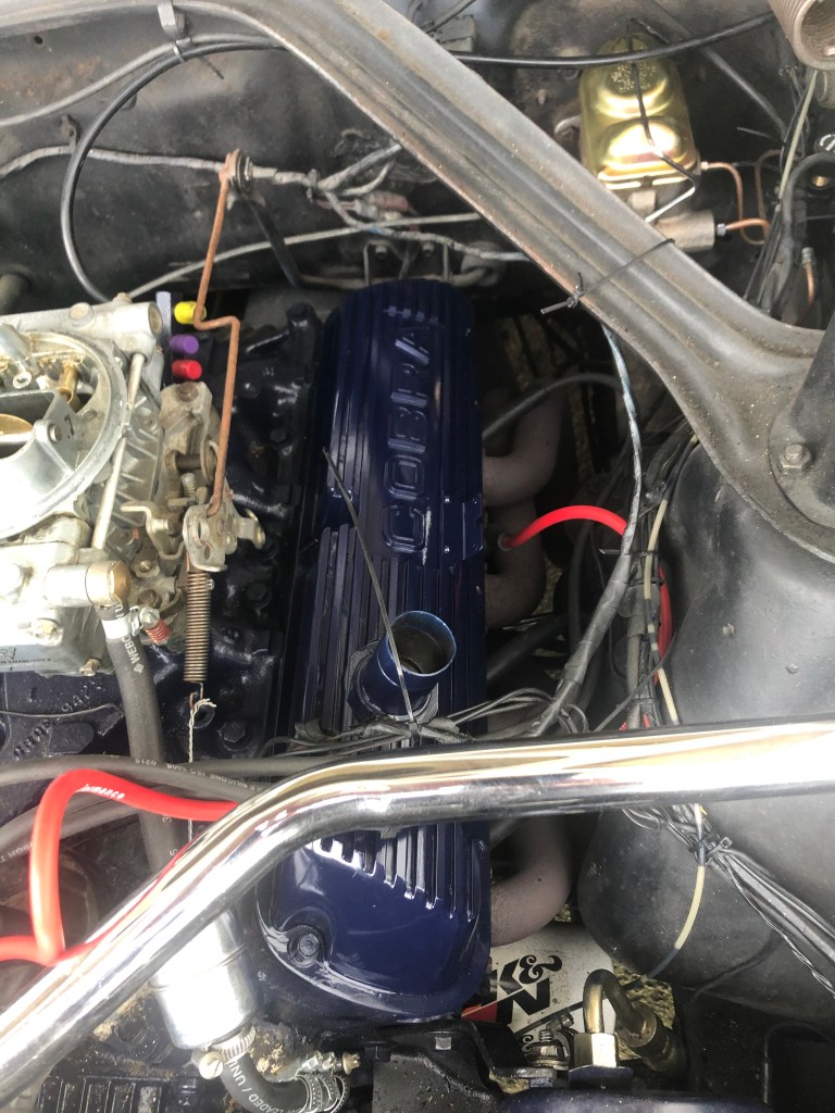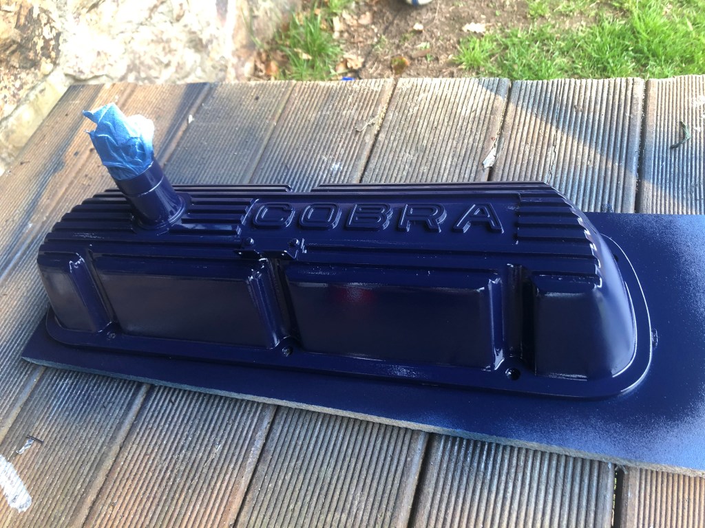 Update – I managed to find the Ford Light Blue colour so have redone the valve covers. This time I also applied two coats of clear top coat. The issue with VHT is that before it is cured, it has to be subjected to operating temperature for at least 20 minutes. Once this is possible I will take the car for a drive. I will also be painting the power steering pump & alternator as well as the engine block.