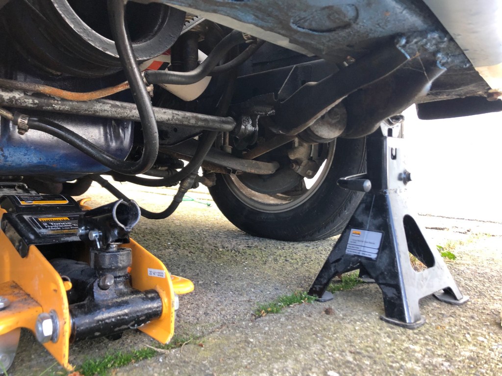 Once jacked up, I moved the axle stands into position, removed the wheels and let the car slowly down. So far so good!