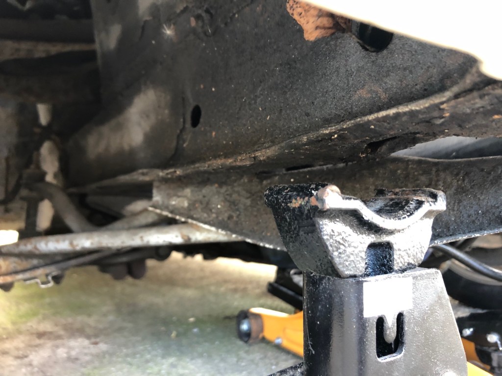 At this point I decided against jacking the car up via the cross member, choosing instead to jack the passenger side the few inches needed, via the standard jack point, to mount the wheel. Once done I jacked it a few more inches in order to remove the jack stand. Then did the same for the driver side. The car is finally back on the ground!