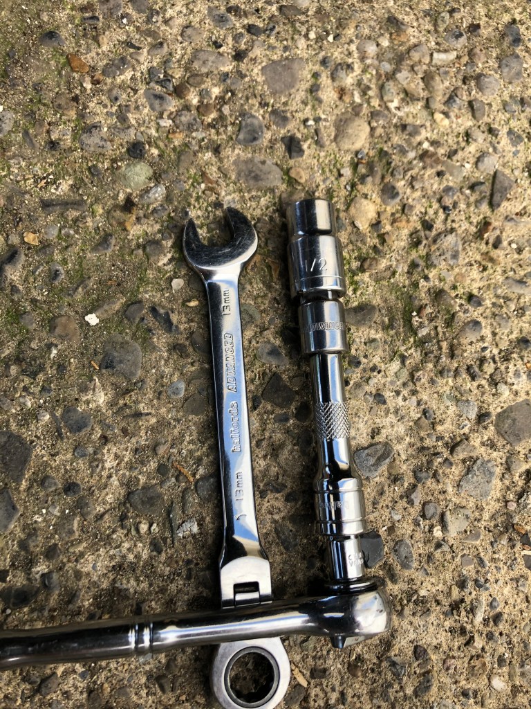 Thankfully the bottom shock nuts (which go through the spring perch) were not that difficult to remove as they had only been on the car 5 years. I remember it being a major pain when I first did it as the nuts were rusted solid. I used a 13 mm spanner on the front nut and a 1/2 (just because I couldn’t find the 13mm socket) with an extension for the rear. I made sure to keep all the mounting hardware as I’ll be using them again. With all the bolts off, you can remove the shock through the top without too much trouble.