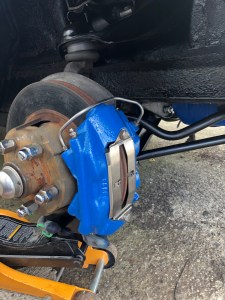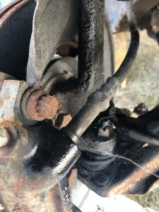 I started on the passenger side, recognising the first thing I needed to do was disconnect the brake line. Unfortunately it refused to disconnect where the rubber brake hose meets the brake line (Fig4), but I was able to undo the connection where the brake line connects to the disc brake housing (Fig5). The problem I had was that it was impossible to undo as the rubber hose was trying to tie itself in knots. The solution was to remove the entire brake caliper and then undo the brake line (Have an oil pan or similar ready to catch the brake fluid)