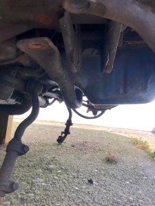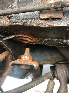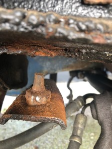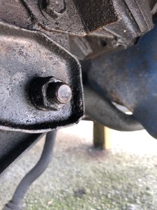 It was now I turned my attention to the sway bar end links and strut rod. As you can tell by the pictures, this hardware is in a sorry state. The mounting hardware for the strut rod was mostly rust and the end link nuts weren’t much better. I decided to give them a liberal soaking of WD-40 (I know there are better products for this type of thing, but I don’t have any).