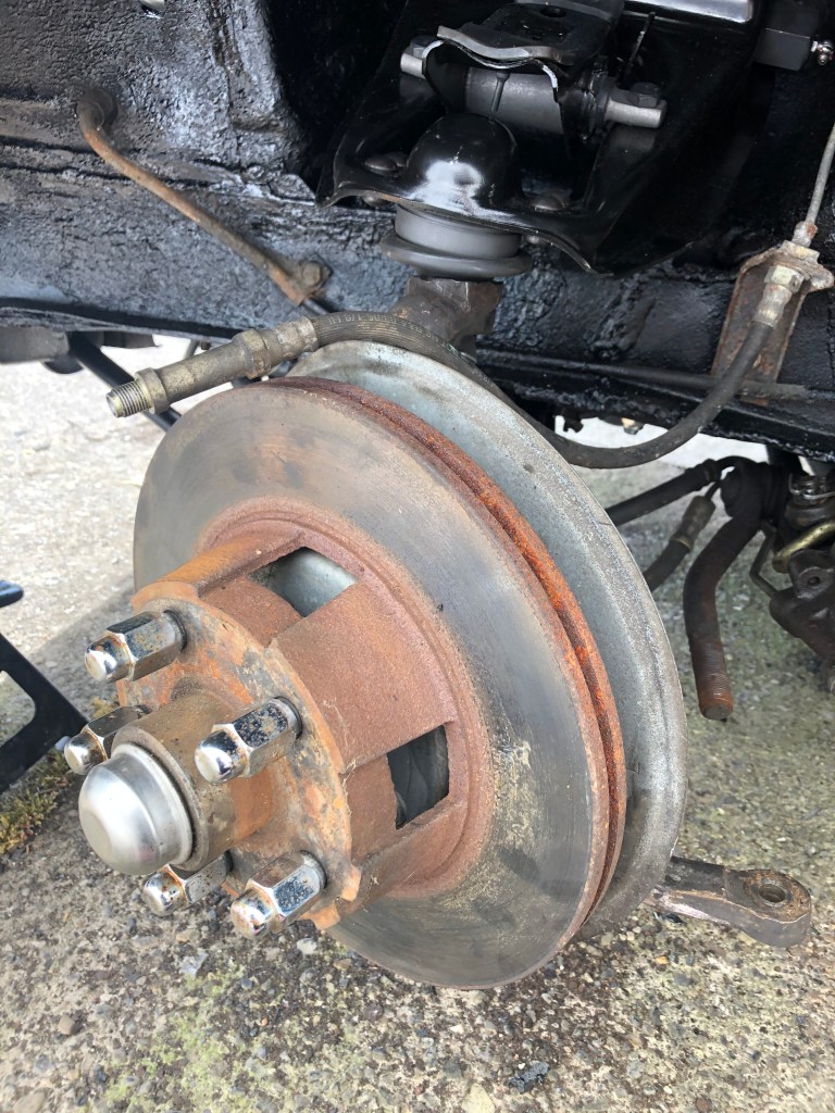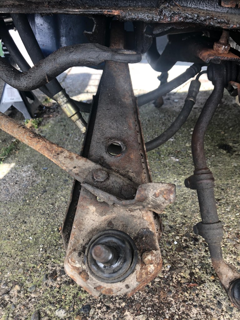 Removing the brake caliper is done by undoing two bolts, connecting it to the wheel spindle. You don’t need to undo the two smaller bolts, which connect each half of the caliper (These are SSBC 09516 – pretty standard for the era). With the brakes off, I moved on to the ball joints.