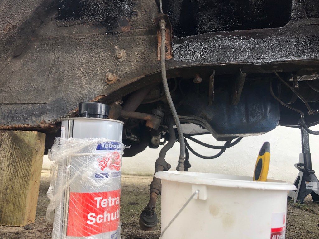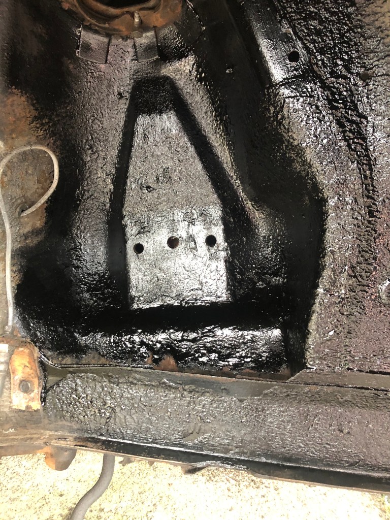Now with all the parts out of the way I started cleaning up the area ready for a coat of underseal. Years of dirt, grease & old underseal made it hard going, but a stiff wire brush and a putty knife did the trick. I used a vacuum cleaner for the top of the frame real, which sucked out quite a lot of dirt. I had purchased an underseal gun to use with my compressor but read that you can also apply it by paintbrush, which is a lot less fuss and mess. I wore eye protection and a face mask to be safe. Each side took 45 minutes and it was dry within 2 hours.