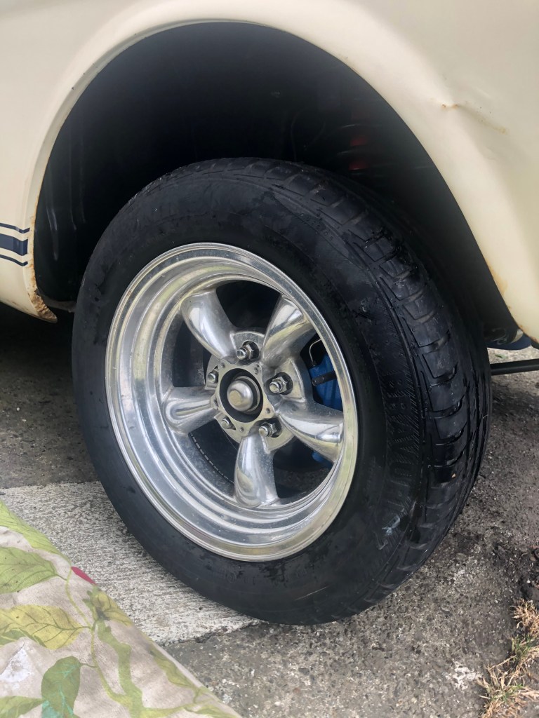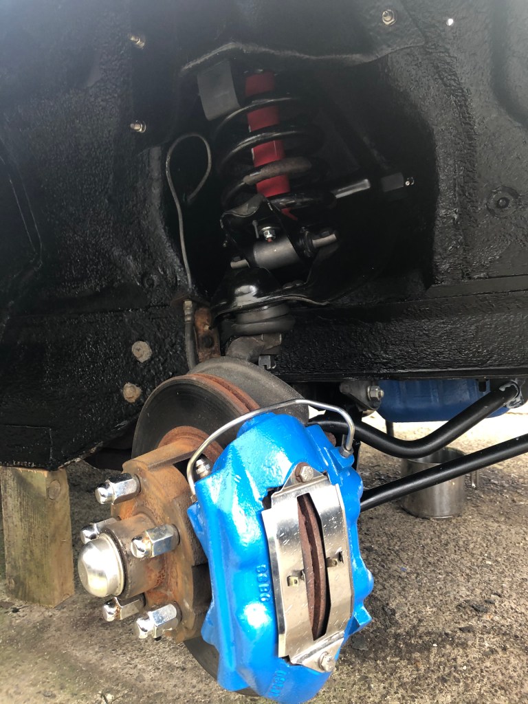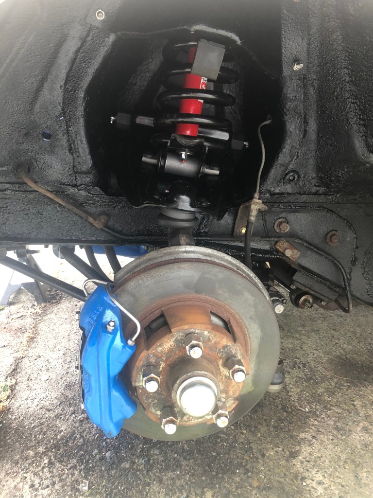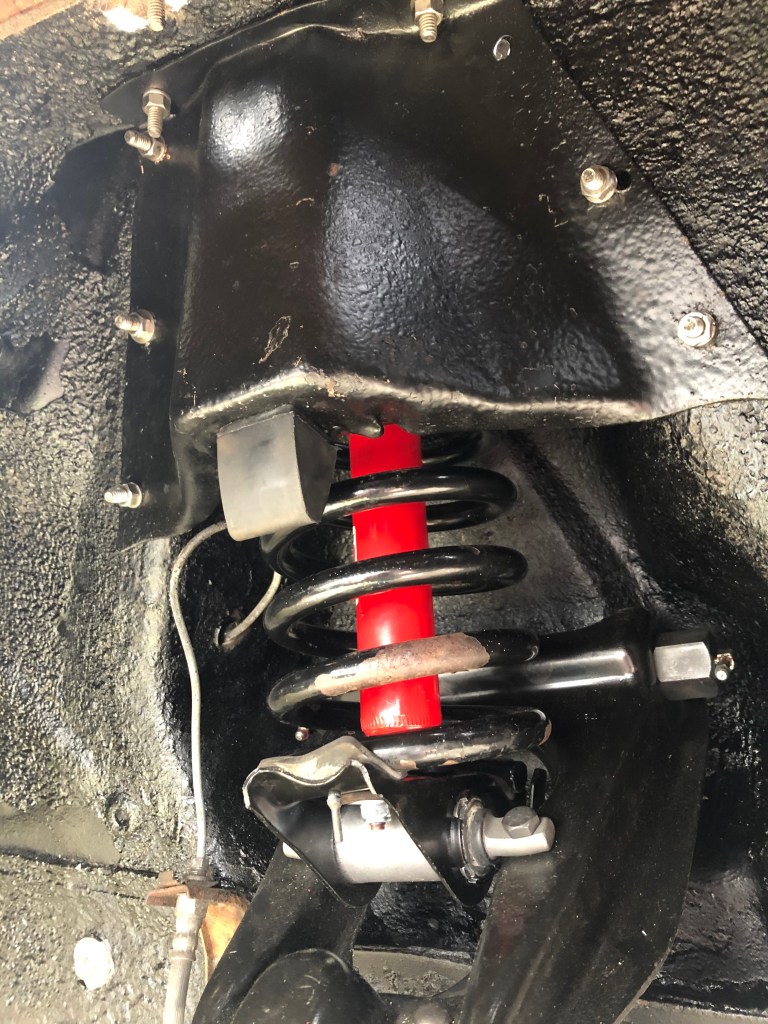 It took a week to arrive but I had one of the springs back on the car in 15 minutes!! – Faster and safer. The new shocks went in next (Scott Drake) and then the shock tower guards. Finally after a month, the car was getting close to being on the ground.